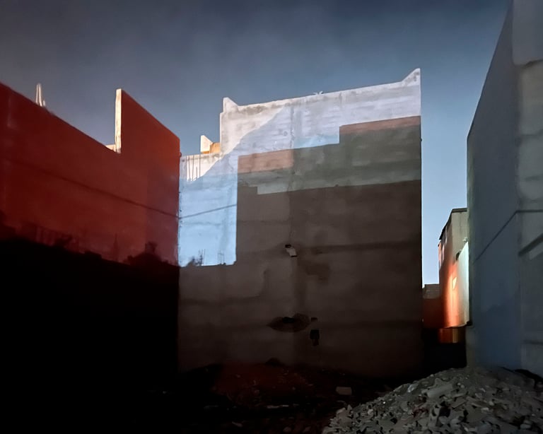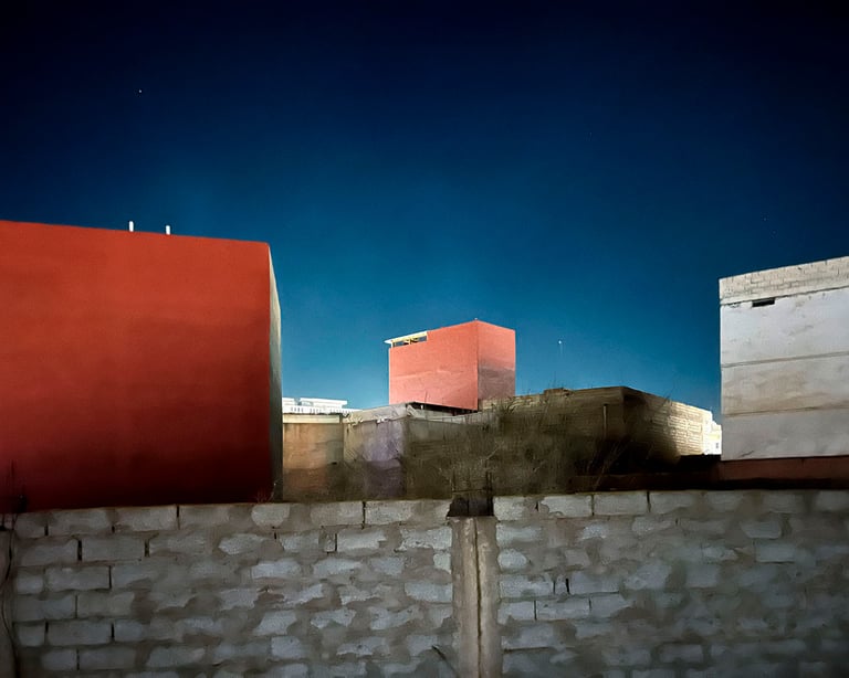 D’une errance nocturne au coeur d’un village du sud Marocain, qui devrait ressembler à une carte postale d’une petite cité balnéaire, surgit un sentiment diffus de désorientation, où s’opposent des volumes sur éclairés et des obscurités profondes, qui brisent alors tout repère temporel. Les paysages urbains de Mirleft vont se transformer en décors de cinéma Lynchéens, atemporels, distordus, entre rêve et réalité, nous offrant des écrins poétiques où se croisent mes thématiques de prédilection « le mystique, l’étrange, le surnaturel, le souvenir, la mélancolie… »